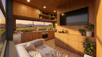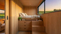 This model includes a full 16’ kitchen, panoramic living space, integrated storage systems, and a private loft bedroom—all wrapped in warm wood finishes for a premium feel.