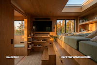 living space, integrated storage systems, and a private loft bedroom—all wrapped in warm wood finishes for a premium feel.